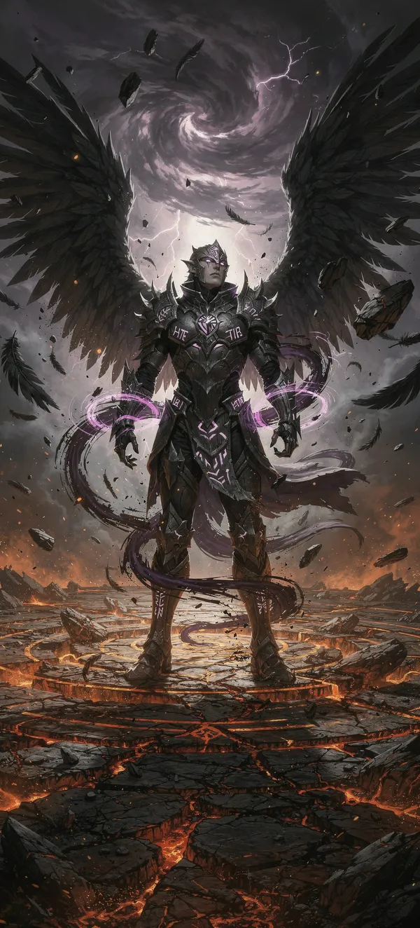GamingImmersive dark fantasy RPG phone wallpaper featuring a powerful fallen angel in battle-scarred armor with dramatic black wings and crackling energy.