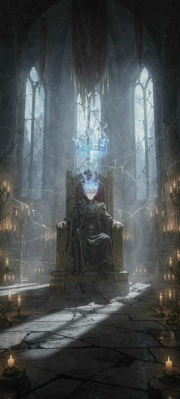 AnimeImmersive anime wallpaper featuring a haunting throne room with spectral crown, ghostly blue light, and mysterious regal atmosphere in stunning HD quality.