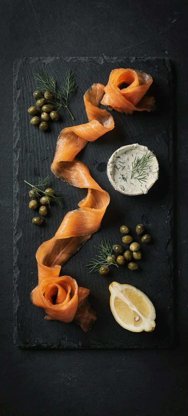 Sophisticated dark slate gourmet food wallpaper featuring delicate smoked salmon, capers, and dill cream cheese. High-resolution culinary art for food lovers.