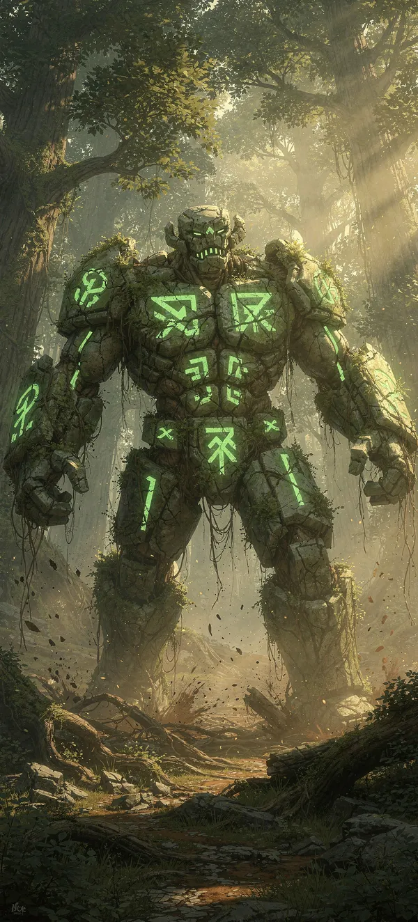 ArtStunning digital art of an ancient stone golem rising in misty woodland, featuring glowing green runes and ethereal morning light. High-quality fantasy landscape wallpaper.
