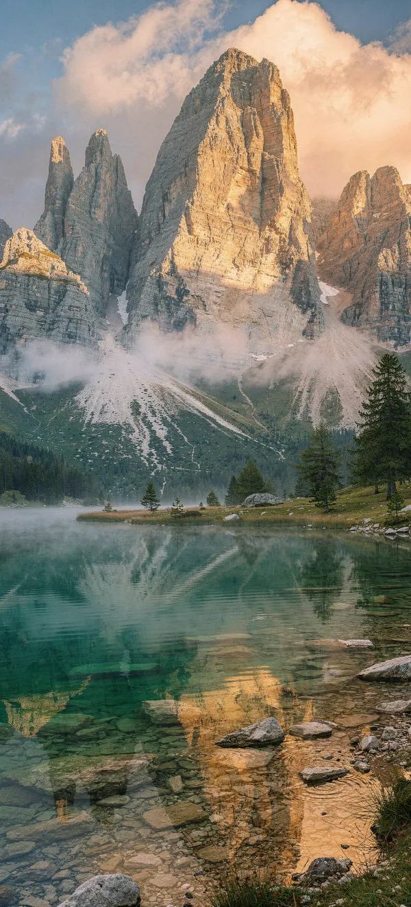 NatureStunning high-resolution wallpaper of a dramatic Dolomite mountain peak perfectly mirrored in a crystal-clear emerald alpine lake with magical morning light.
