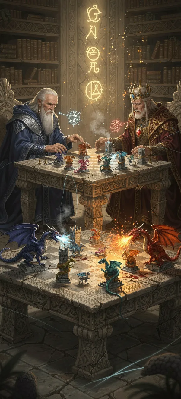 FantasyImmersive magical fantasy wallpaper featuring mystical wizards and living dragon chess pieces battling on an enchanted game board. High-quality fantasy art design.