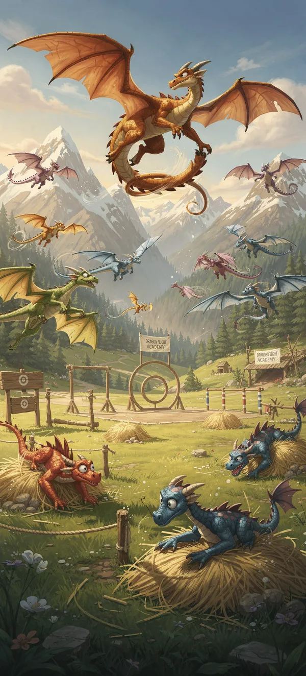 FantasyImmersive fantasy phone wallpaper featuring young dragons practicing aerial maneuvers over a scenic mountain valley with epic dragon flight training scenes.