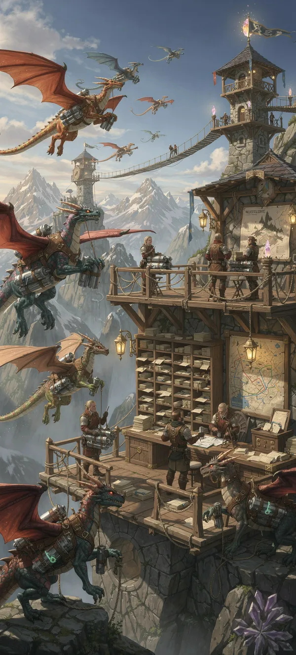 FantasyStunning fantasy phone wallpaper featuring dragon postal workers delivering messages across mountain peaks, high-resolution magical communication scene.