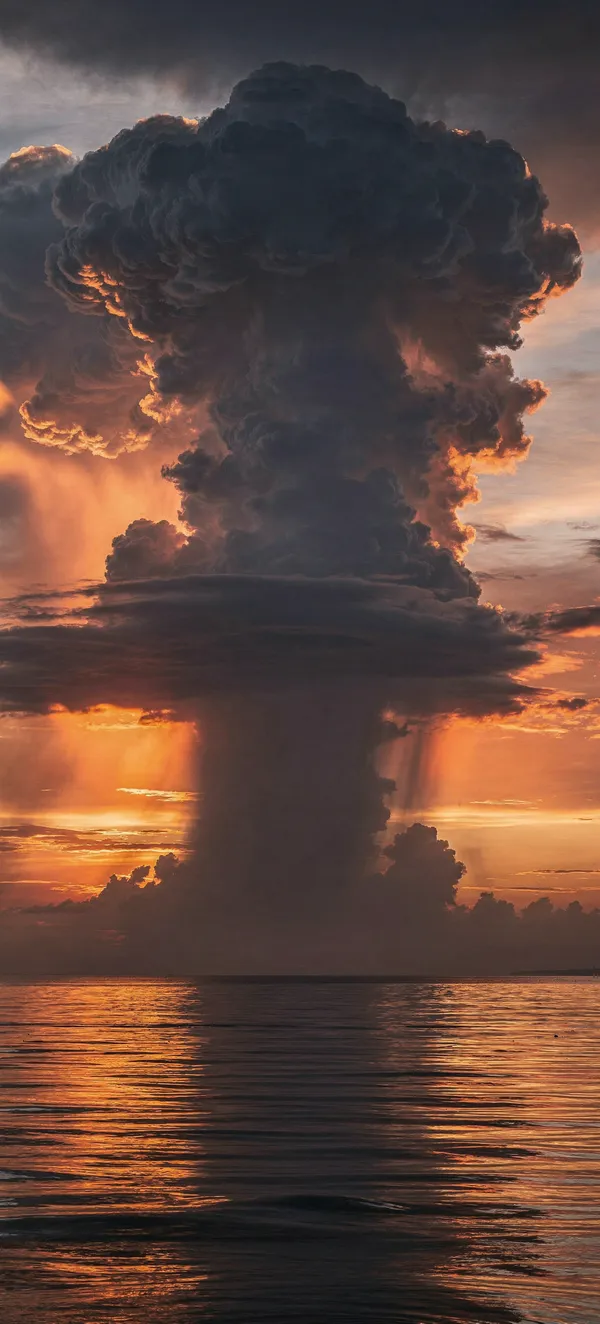 NatureStunning 4K phone wallpaper featuring a dramatic tropical storm sunset with massive cumulonimbus clouds illuminated in vibrant orange and deep red over a calm ocean.