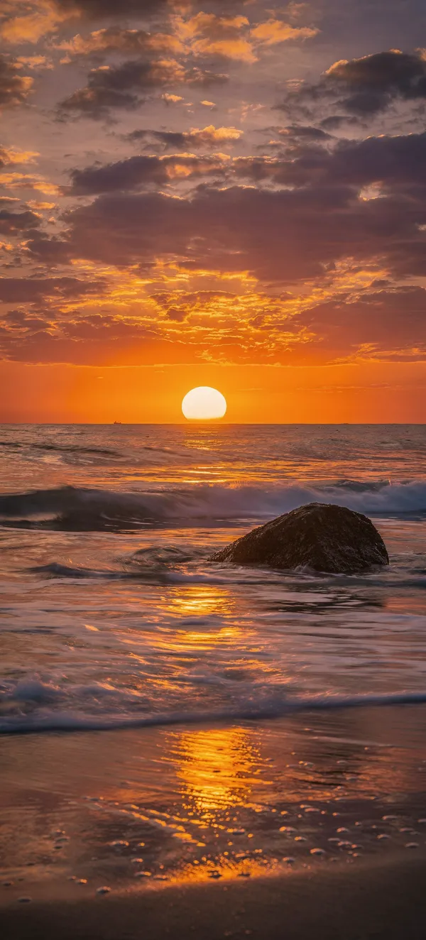 NatureExperience breathtaking nature photography with this high-resolution sunset seascape featuring golden sky, smooth water, and a solitary rock against a vibrant horizon.