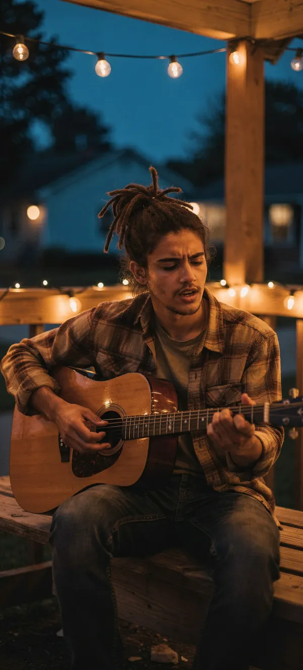 PeopleIntimate evening scene of a passionate young guitarist with dreadlocks, warm string lights, and a cozy small-town atmosphere perfect for phone backgrounds.