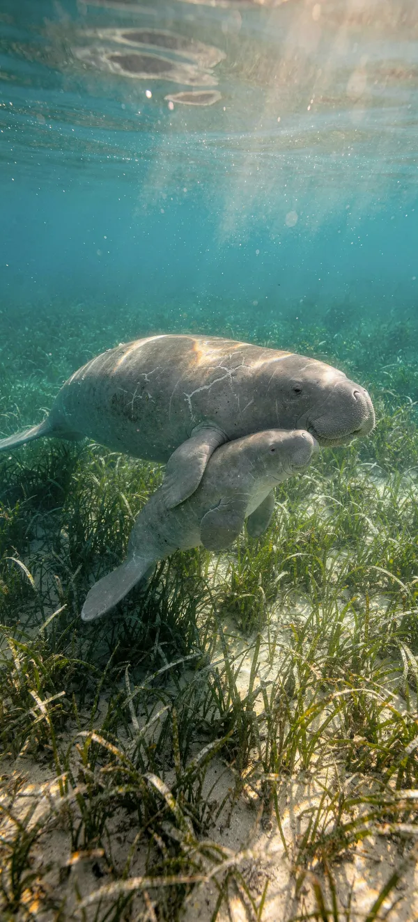 AnimalsTranquil underwater scene featuring a gentle dugong mother and baby swimming through lush seagrass in crystal-clear tropical waters. High-quality marine life mobile background.
