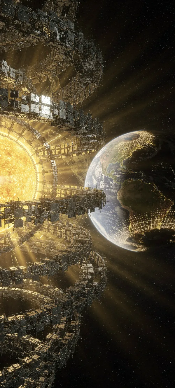 SpaceStunning sci-fi wallpaper featuring a futuristic Dyson swarm surrounding a yellow star with geometric solar collectors and vibrant energy rays.