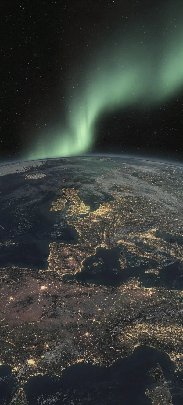 SpaceStunning photorealistic phone wallpaper featuring Earth from orbit, vibrant green aurora borealis, and starry cosmic background in high-resolution detail.
