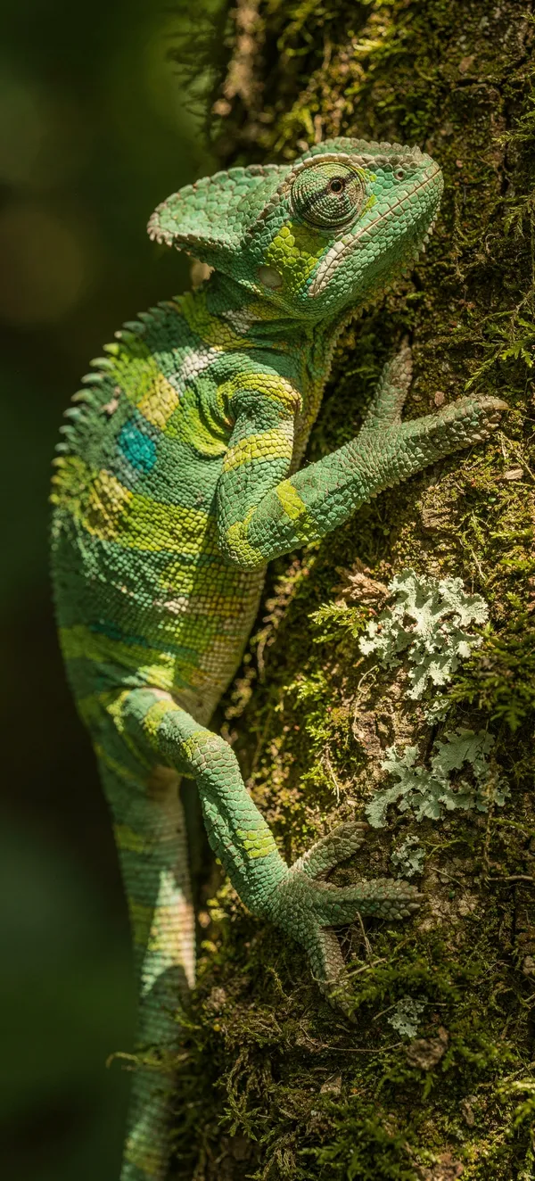 Animals Ultra-sharp macro wallpaper featuring a stunning emerald green chameleon perfectly blending with moss-covered bark, showcasing incredible wildlife detail and adaptive camouflage.