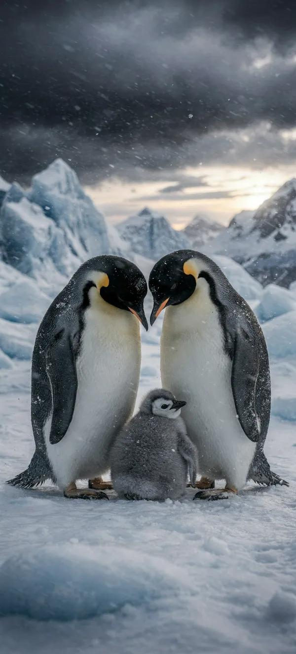 Stunning high-resolution mobile wallpaper featuring emperor penguins protecting their chick in a dramatic Antarctic blizzard with epic storm clouds and icy landscape.
