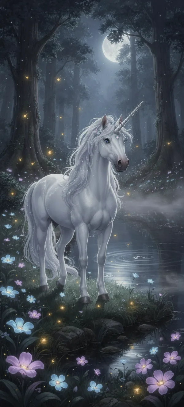 FantasyStunning fantasy phone wallpaper featuring a mystical white unicorn in a moonlit forest with glowing flowers and soft ethereal light. High-resolution magical background.