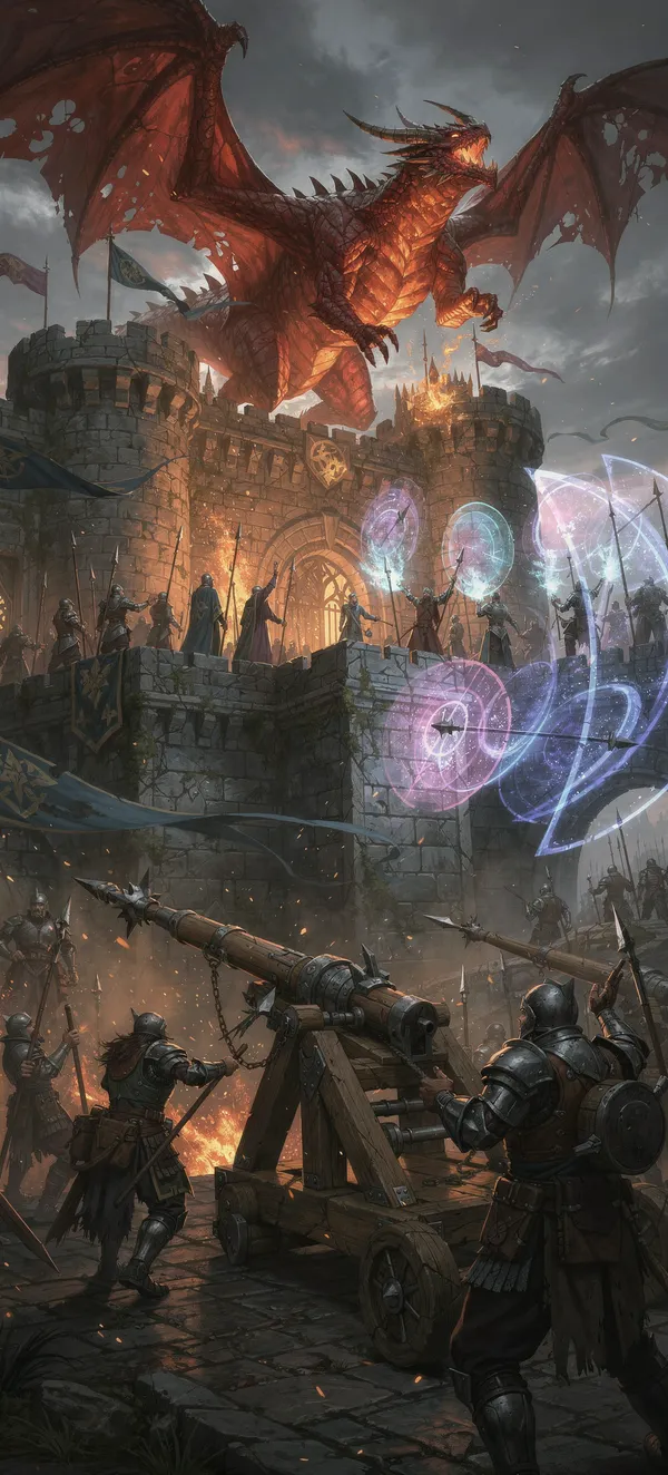 FantasyImmersive fantasy battle wallpaper featuring a massive red dragon attacking a stone castle with magical defenders. High-resolution 4K fantasy art for mobile.