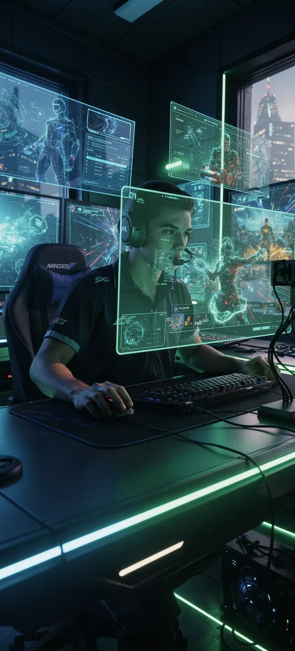 SportsUltra-detailed high-resolution gaming wallpaper featuring professional e-sports player in futuristic neon setup with holographic digital screens and dynamic tech environment.