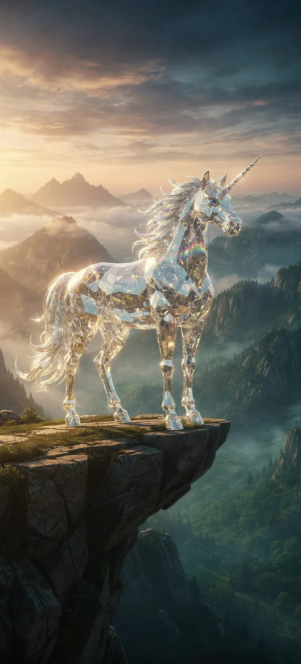 FantasyUltra-detailed fantasy phone wallpaper featuring a magical crystal unicorn on an emerald mountain at golden twilight. High-resolution 4K fantasy art for mobile screens.