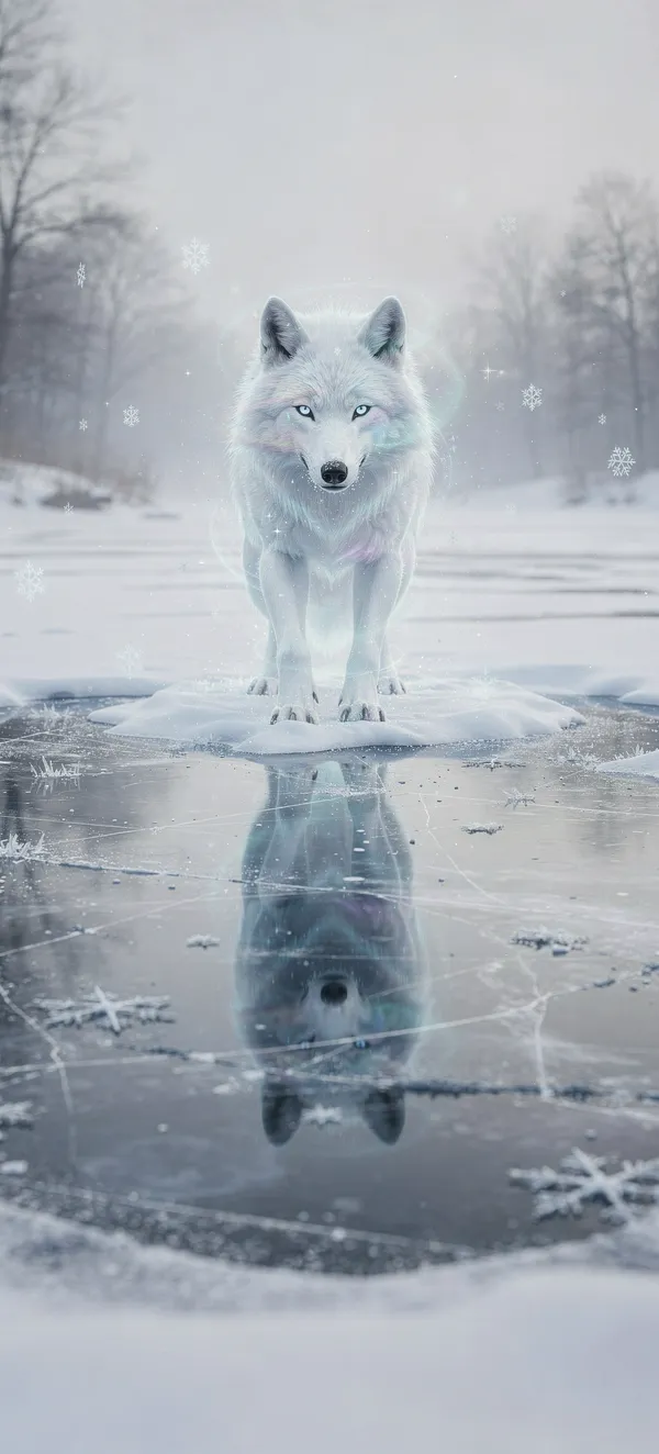 Ultra-detailed anime-style wolf spirit wallpaper with dreamy winter forest reflection. High-quality 4K magical wildlife scene for phone backgrounds.