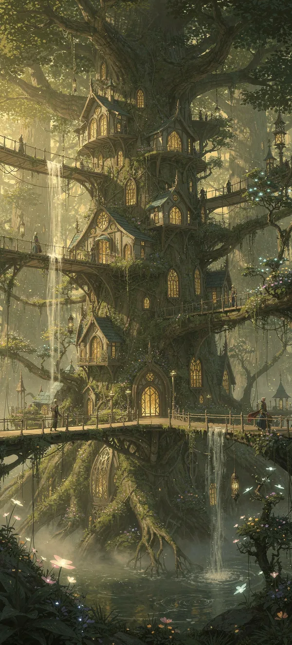 FantasyImmerse your phone in a stunning fantasy landscape with an ethereal elven city nestled among giant golden-green trees, featuring intricate architectural details and magical lighting.