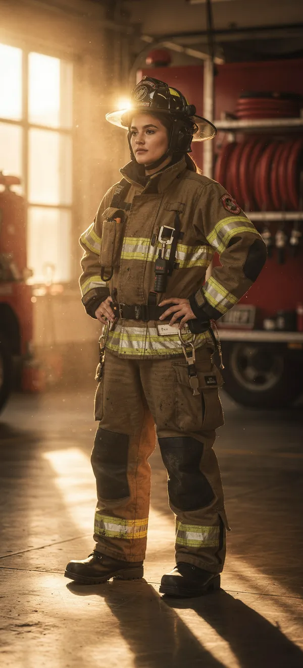 PeoplePowerful photorealistic golden-hour portrait of a female firefighter in protective gear, dramatic lighting and vibrant orange tones. High-quality phone wallpaper.