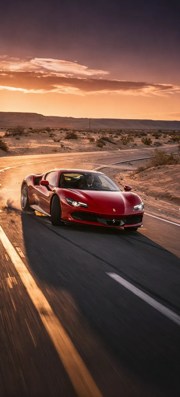 CarsExperience breathtaking automotive art with this stunning Ferrari 296 GTB drifting in golden sunset light. High-resolution 4K phone wallpaper for sports car enthusiasts.