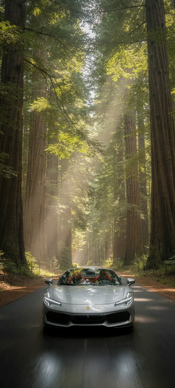 CarsStunning Ferrari 296 GTS in silver, driving through majestic California redwood forest. High-resolution automotive wallpaper for phone with breathtaking landscape.