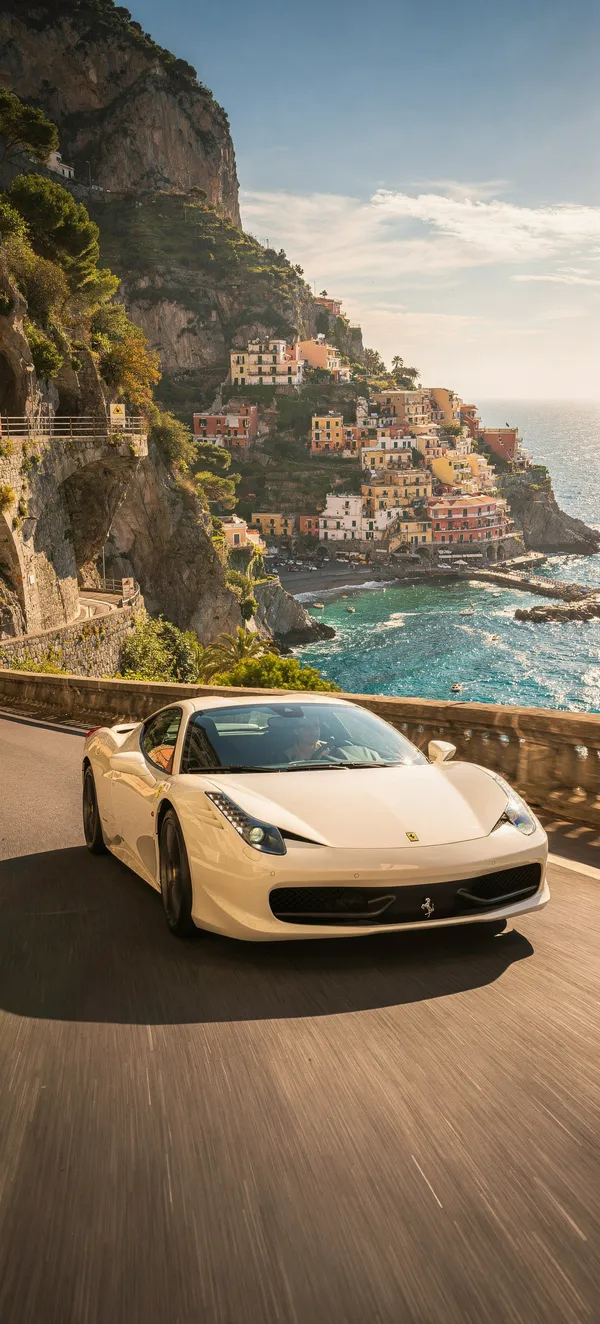 CarsStunning white Ferrari 458 Italia supercar wallpaper featuring dramatic Amalfi Coast scenery with azure sea, cliffs, and picturesque Italian villages in high-resolution HD.