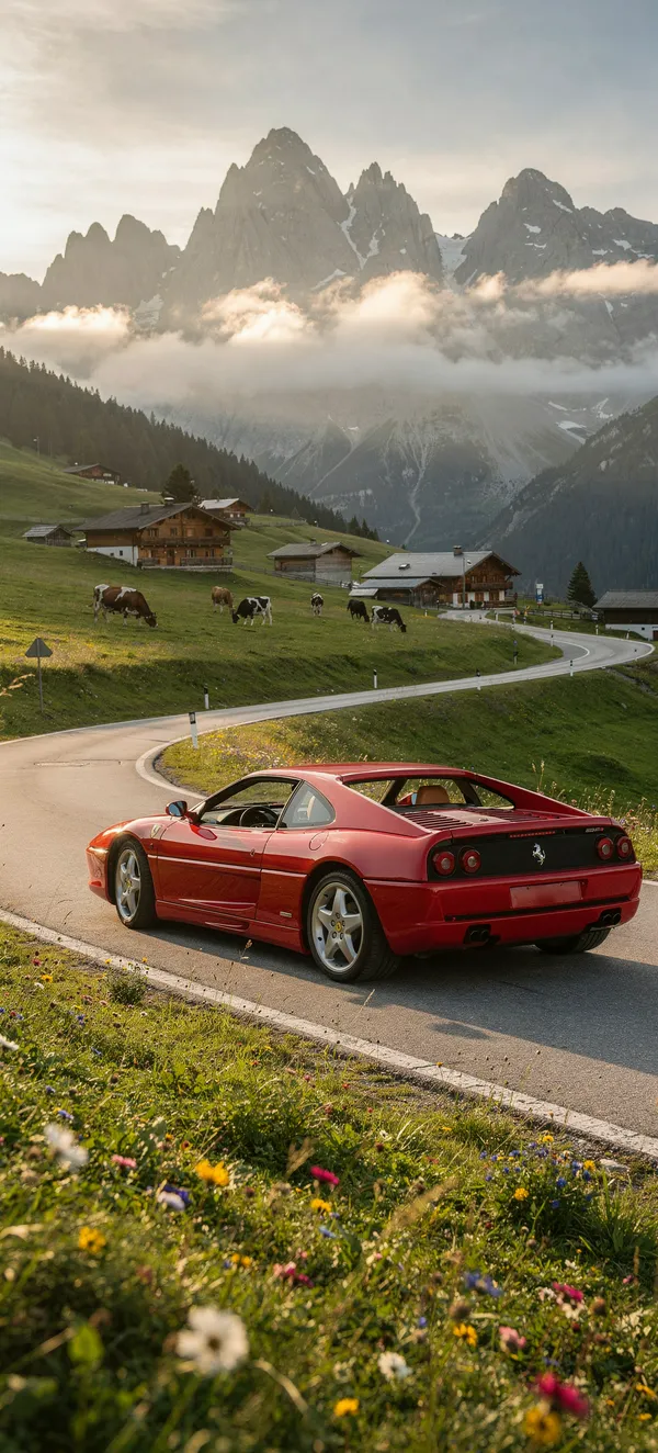 High-resolution supercar wallpaper featuring iconic Ferrari F355 Berlinetta in Rosso Corsa, racing through stunning Swiss alpine landscape with mountain peaks and meadows.