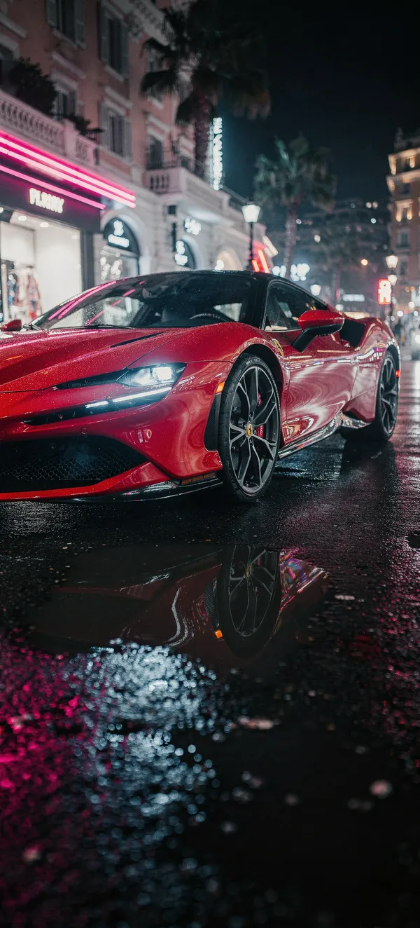 CarsUltra-realistic 4K phone wallpaper of a stunning red Ferrari SF90 Stradale on a wet Monaco street with vibrant neon reflections and cinematic lighting.
