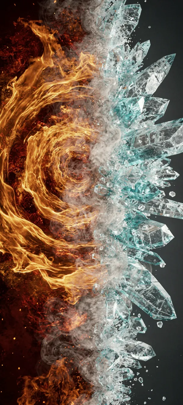 AbstractDynamic abstract phone wallpaper featuring a mesmerizing split composition of burning flames and crystalline ice fractals, creating a stunning visual collision of elements.