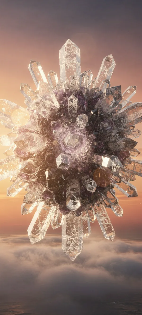 AbstractStunning abstract phone wallpaper featuring surreal floating crystal formations against a warm sunset gradient sky. High-resolution 4K artistic landscape design.