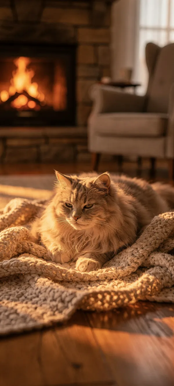 AnimalsPhotorealistic fluffy cat resting by a glowing fireplace. High-quality, cozy animal wallpaper for smartphone backgrounds with warm orange tones.