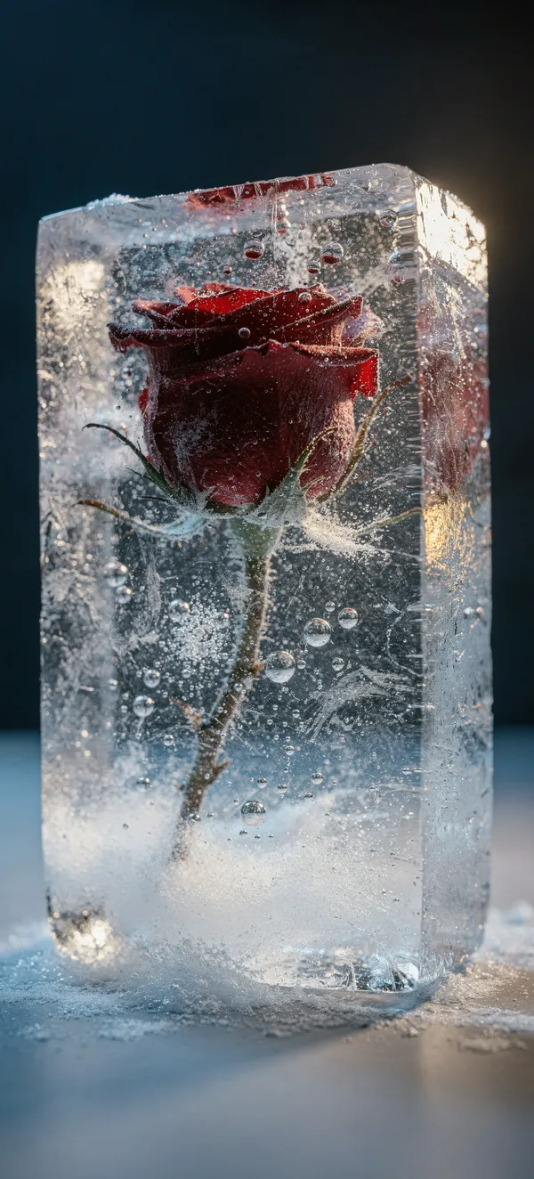 FlowersStunning artistic wallpaper featuring a red rose perfectly preserved in a crystalline ice block, with dramatic blue lighting and intricate frozen details for your phone background.