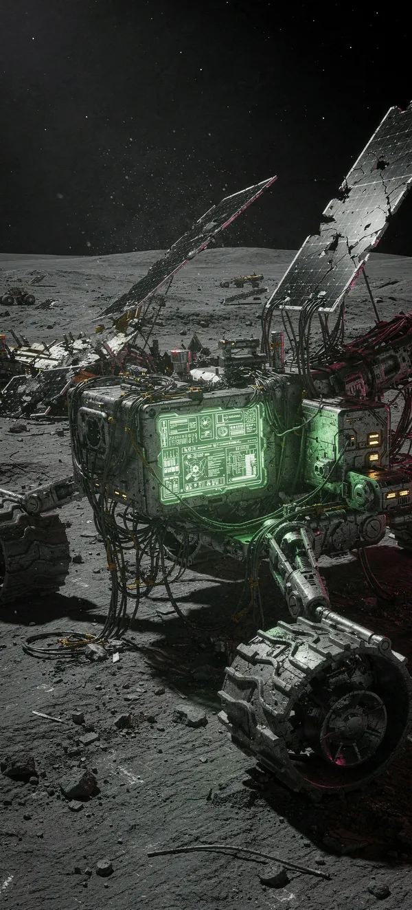 SpaceDiscover a stunning 4K sci-fi wallpaper of an abandoned lunar exploration rover with dramatic neon-green lighting and intricate mechanical details.