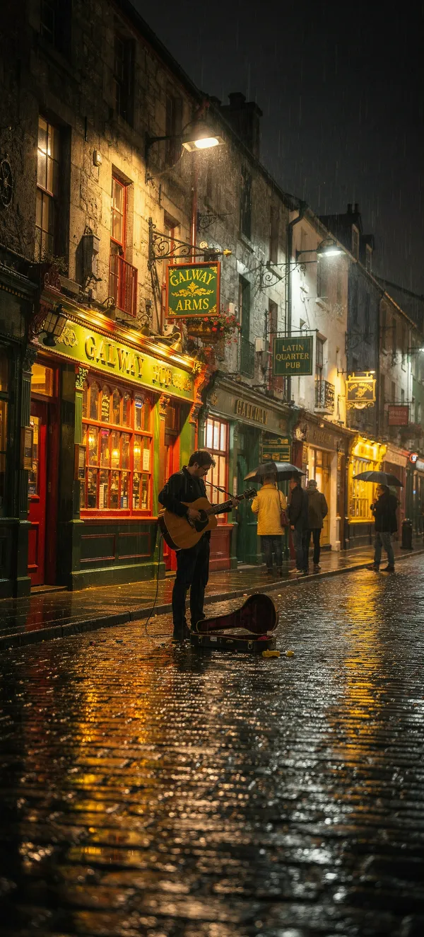 CityStunning 4K phone wallpaper of Galway's Latin Quarter at night, featuring colorful pub reflections on wet cobblestones, warm atmospheric lighting, and urban Irish charm.