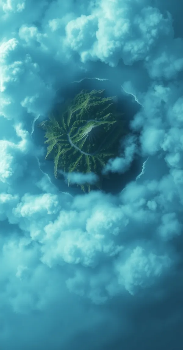 GamingAerial view of mysterious island with storm circle closing in, dramatic clouds, battle royale game map aesthetic, photorealistic, 4K phone wallpaper