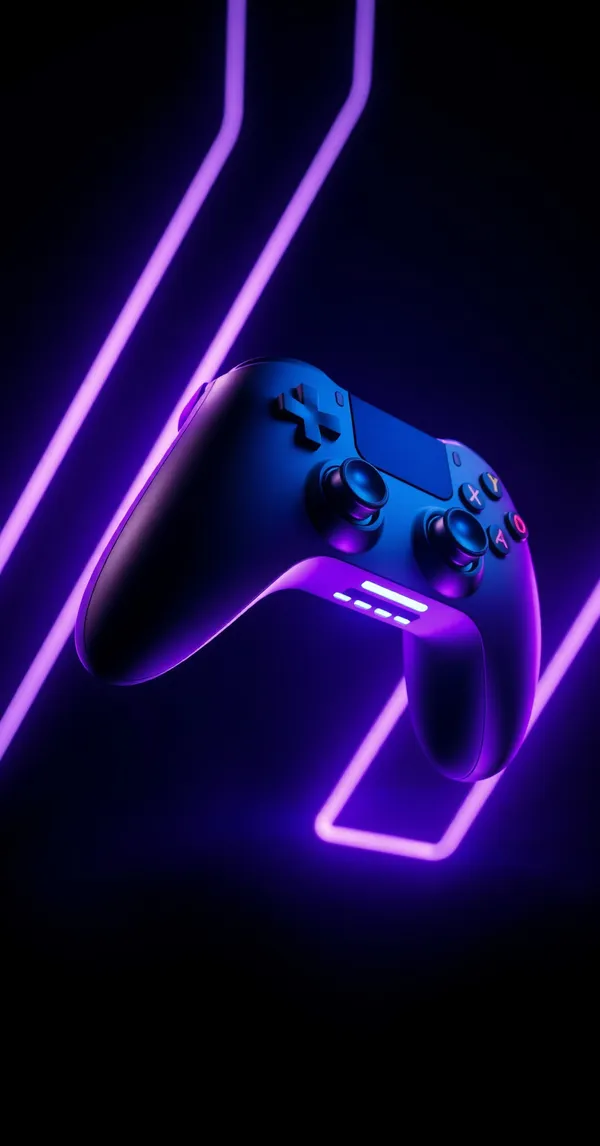 Gaming controller floating in dark space with neon purple and blue glow effects, dramatic lighting, photorealistic 3D render, 4K phone wallpaper