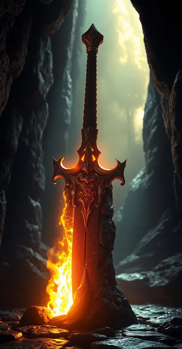 GamingGlowing legendary sword stuck in stone in dark dungeon, golden light emanating, fantasy RPG game art, photorealistic, 4K phone wallpaper
