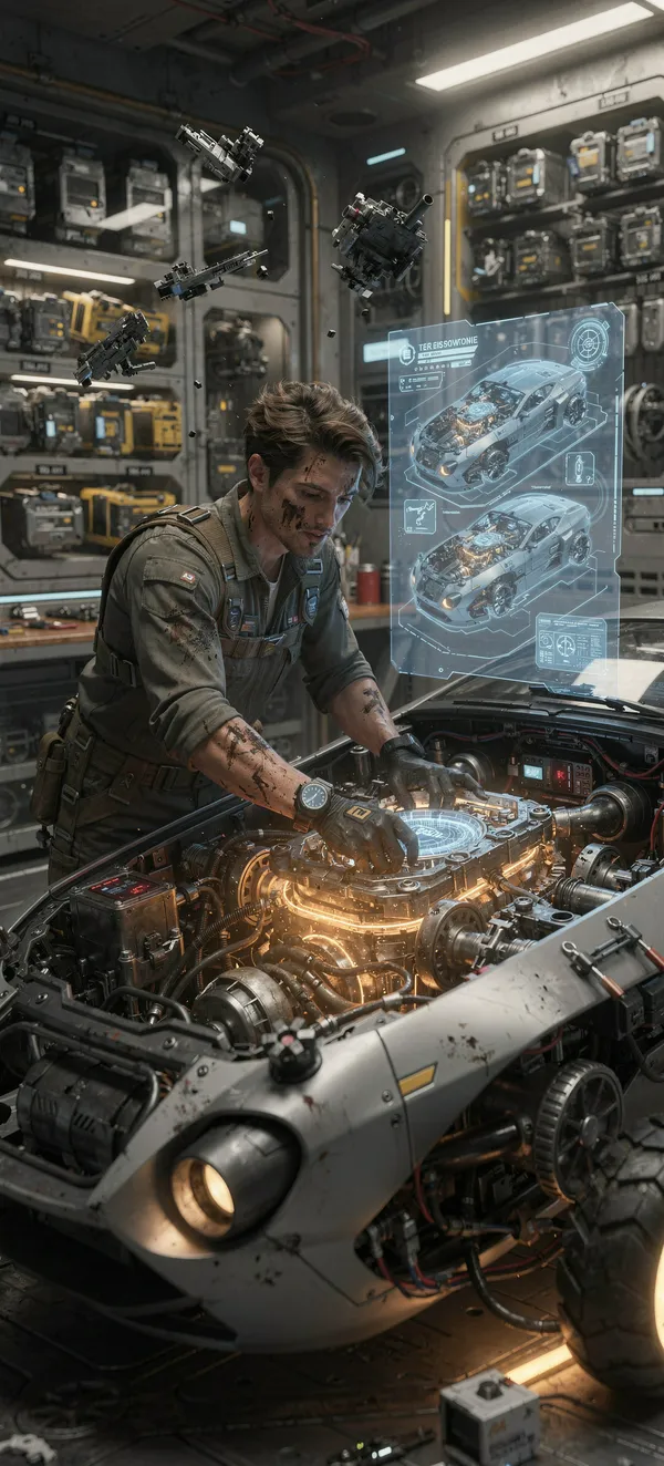 Immersive sci-fi mechanic wallpaper featuring a detailed zero-gravity workshop with floating tools and holographic schematics, perfect for gaming enthusiasts.