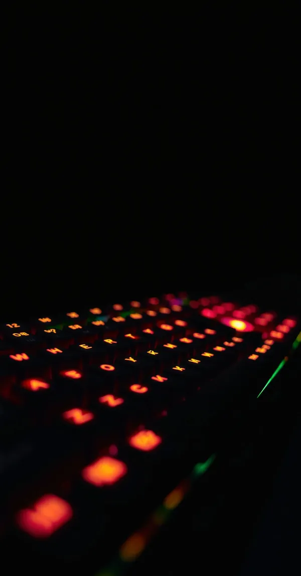 GamingMechanical gaming keyboard with RGB lighting in dark room, keycaps glowing rainbow, shallow depth of field, photorealistic, 4K phone wallpaper