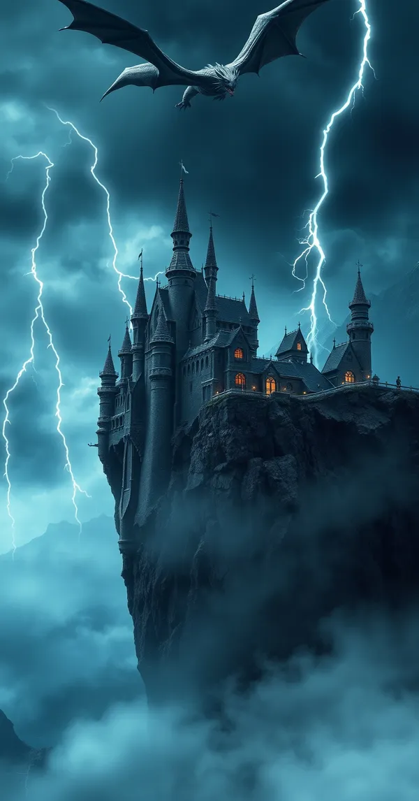 GamingEpic dark fantasy castle on cliff edge, thunderstorm, dragon flying overhead, dark souls aesthetic, photorealistic game art, 4K phone wallpaper