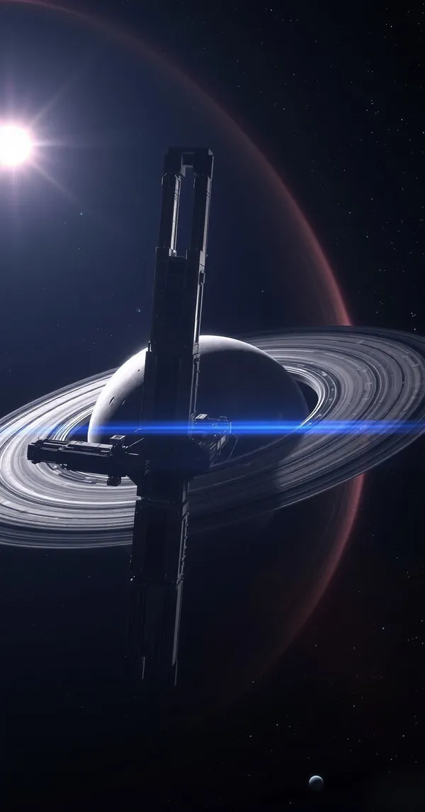Massive space station orbiting ringed planet, sci-fi game art, dramatic lighting from nearby star, photorealistic, 4K phone wallpaper