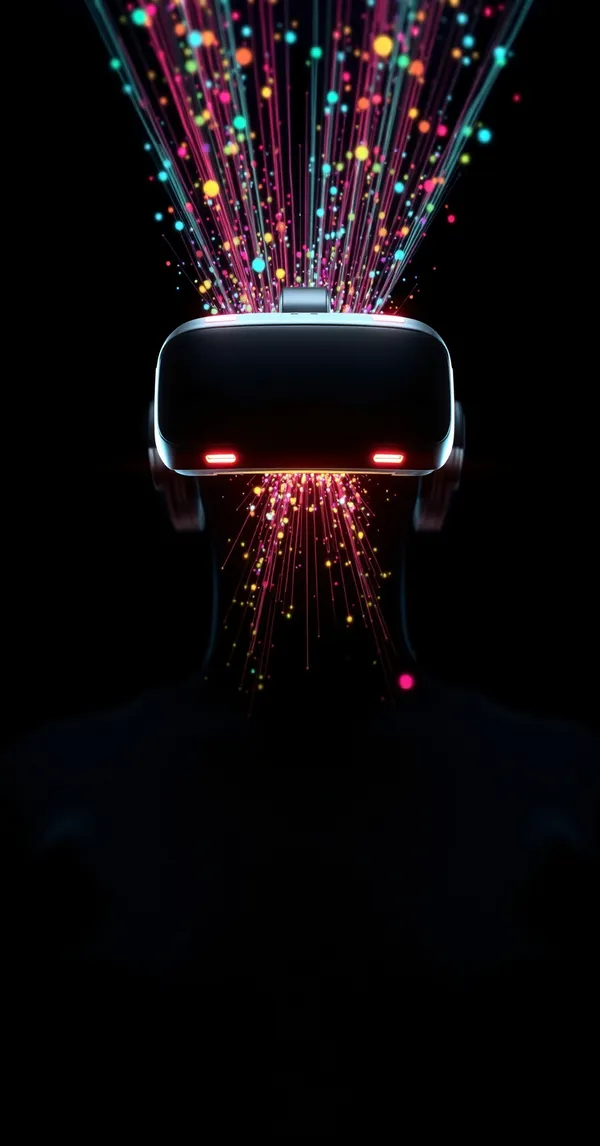 VR headset with colorful digital particles streaming out, dark background, futuristic gaming tech, photorealistic 3D render, 4K phone wallpaper