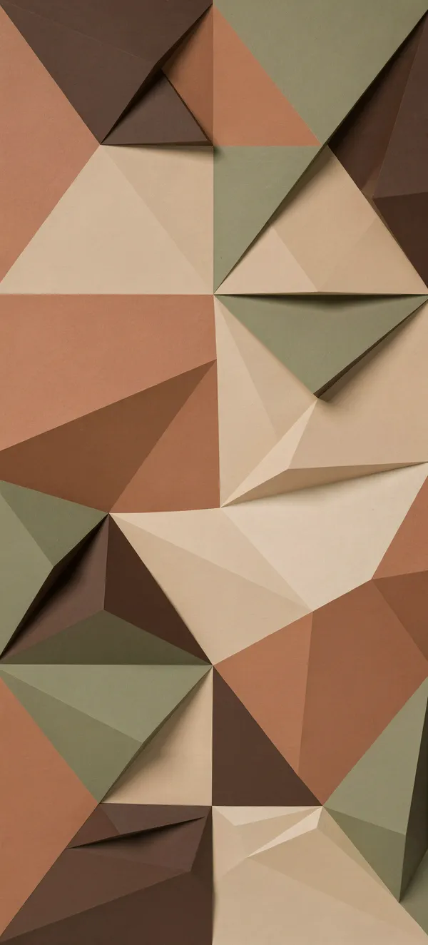 AbstractSophisticated low-poly abstract wallpaper featuring soft triangular shapes in warm terracotta, sand, olive, and dark brown tones with elegant matte finish.