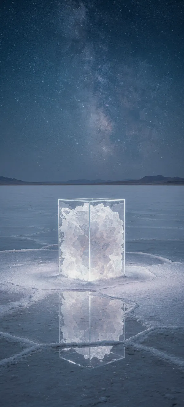 FoodStunning minimalist desert landscape wallpaper featuring luminescent salt flat, glass cube, and starry night sky. High-resolution vertical design for mobile backgrounds.