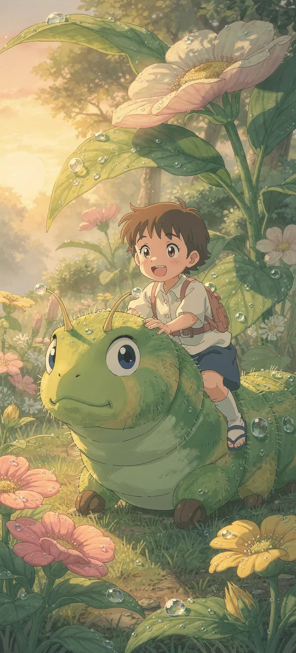 AnimeEnchanting anime wallpaper featuring a whimsical child riding a giant caterpillar through a dewy garden with oversized flowers and magical scale shift.