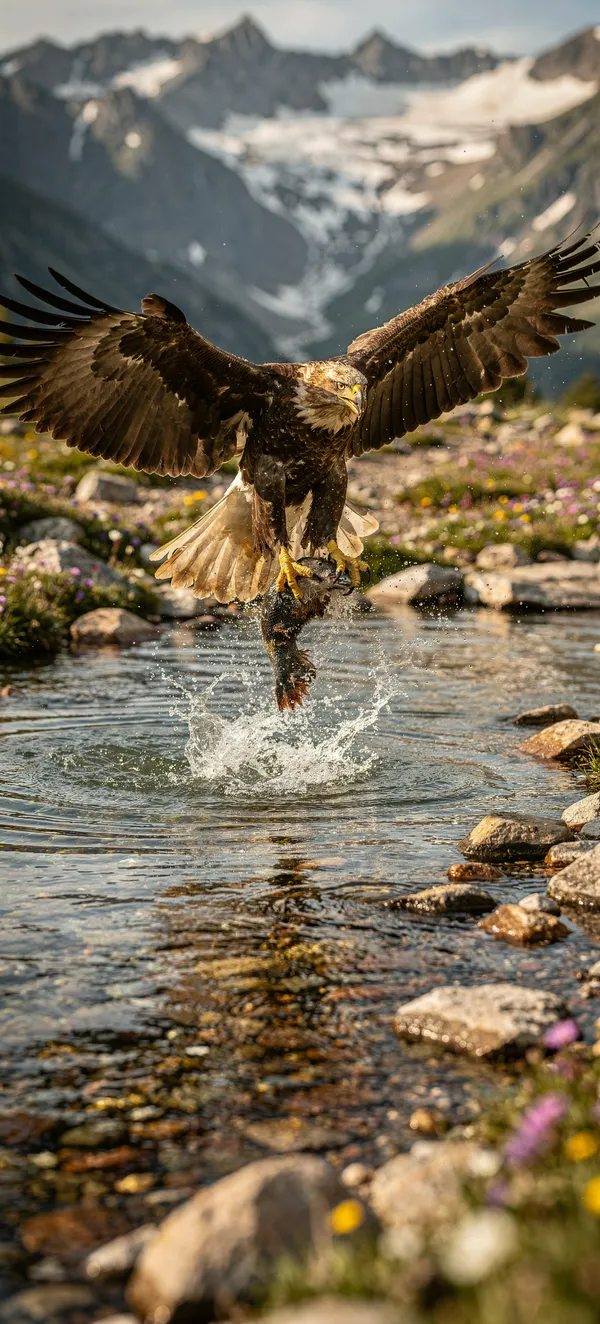 AnimalsDramatic wildlife phone wallpaper featuring a powerful golden eagle catching prey mid-strike in a stunning alpine stream with dynamic water splash and wildflowers.