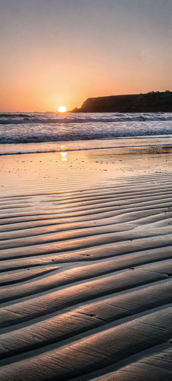Serene minimalist beach wallpaper with golden sunset, perfect sand ripples, and tranquil coastal landscape. High-resolution nature background for mobile.