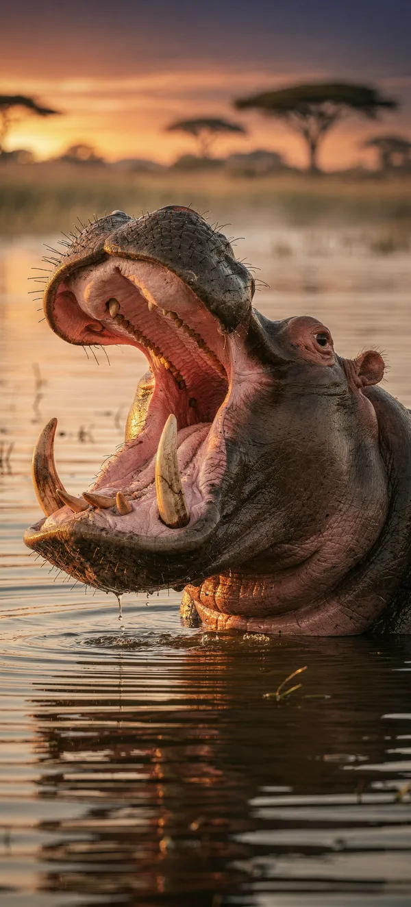 AnimalsStunning wildlife phone wallpaper featuring a massive hippo yawning at sunset in an African river landscape. High-resolution animal portrait in golden light.