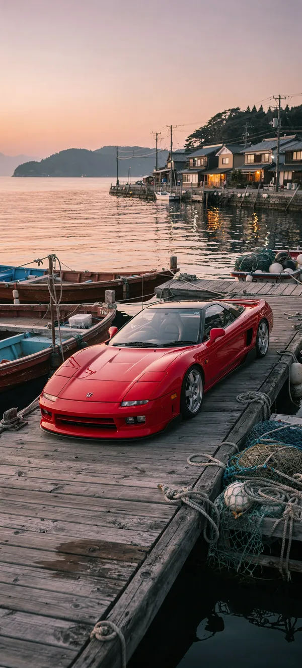 CarsClassic Japanese sports car wallpaper featuring Honda NSX NA1 in Formula Red against serene fishing village sunset background. High-quality automotive landscape image.