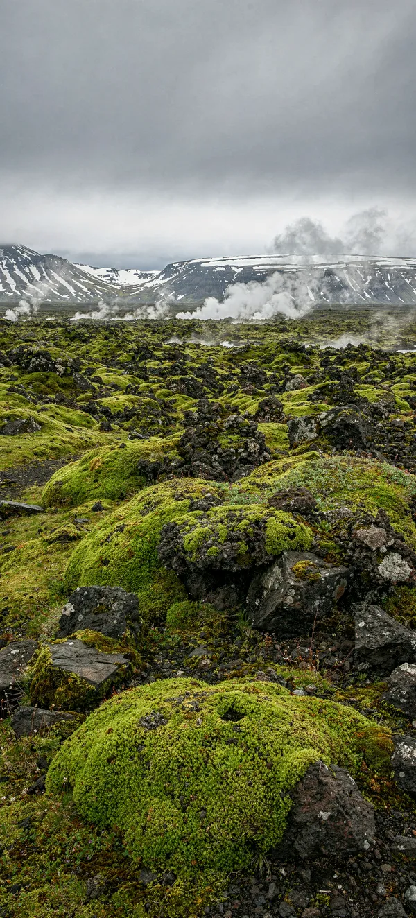 NatureStunning HD wallpaper of moss-covered volcanic landscape in Iceland. Serene natural scene with green textures, steam vents, and dramatic mountain backdrop.